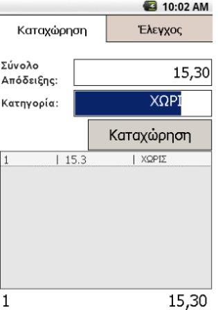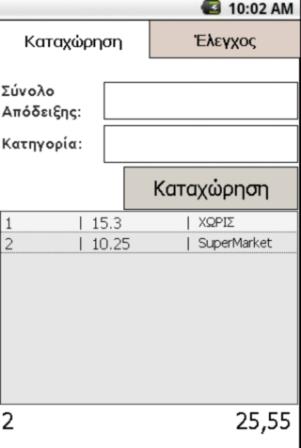 Ο μετρητής αποδείξεων είναι ένα πρόγραμμα με το οποίο μπορείτε να καταχωρήσετε καθημερινά τις αποδείξεις που παίρνετε και να τις κατατάξετε σε κατηγορίες . Τα στοιχεία μπορούν να γίνουν εξαγωγή στην κάρτα sd του κινητού σε μορφή txt ή να αποσταλούν με e-mail σε μορφή απλού κειμένου. (αυτή την στιγμή γίνετε εξαγωγή δεδομένων συνολικά γραμμή γραμμή , και όχι ανά κατηγορία ). Δίνετε η δυνατότητα προβολής συνόλου ανά κατηγορία ενώ μπορείτε να δημιουργήσετε τις δικές σας κατηγορίες μέσα από το μενού της εφαρμογής.Αποκτήστε το από εδώ: https://play.google.com/store/apps/details?id=com.mountainsoftware.apodiksis