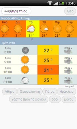 Meteo kairos mainΟι εφαρμογές για την πρόγνωση του καιρού είναι εγκατεστημένες στα περισσότερα smartphones, για να μην πούμε σε όλα. Από τις πρώτες εφαρμογές που εγκαθιστά κάποιος είναι αυτή του καιρού, αν και οι περισσότερες εταιρίες κατασκευής κινητών τηλεφώνων και tablets έχουν προεγκατεστημένες τέτοιες εφαρμογές. Μια καλή και αξιόπιστη είναι και η ελληνική Καιρος που λαμβάνει πληροφορίες από το Meteo kairos .com. Οι πληροφορίες που μας δίνει είναι αρκετές για τη θερμοκρασία, το ύψος χιονιού και βροχής και άλλα καθώς επίσης και εμφάνιση καιρού αν έξι ώρες. Μπορείτε να κάνετε αναζήτηση με geolocation, αλλά και ανά νομό και περιοχή.
