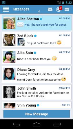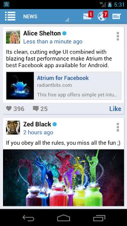 Πολλοί από τους χρήστες της εφαρμογής του Facebook, παραπονιούνται ότι η εφαρμογή της εταιρίας δεν είναι καλή. Σίγουρα είναι από τις πιο βαριές εφαρμογές, ενώ δεν μπορεί να ανοίξει σωστά σε πιο παλιές συσκευές. Πολλές ακόμα εφαρμογές τρίτων προσπάθησαν να αντικαταστήσουν την επίσημη εφαρμογή του Facebook, αλλά τα αποτελέσματα δεν είναι και τα καλύτερα. Με το Atrium για το Facebook παραμένετε συνδεδεμένοι, μαθαίνετε τα τελευταία νέα, και διατηρείτε επαφή με τους φίλους σας στο Facebook, όλα αυτά σε μία εφαρμογή. To απλό σχεδιαστικά, τελευταίας τεχνολογίας περιβάλλον εργασίας του, σε συνδυασμό με την απίστευτα γρήγορη απόδοση του, κάνουν το Atrium μία από τις καλύτερες Facebook εφαρμογές που είναι αυτή τη στιγμή διαθέσιμες για Android. Μια δοκιμή θα σας πείσει.