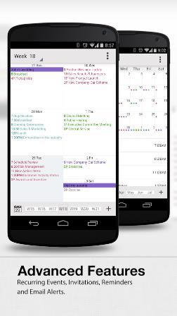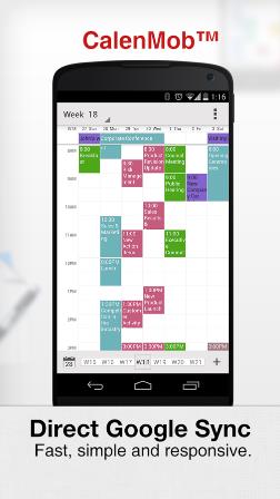Η εφαρμογή CalenMob συνδυάζεται άψογα με το Google Calendar app και προσφέρει ένα έξυπνο σχεδιασμό για το αγαπημένο σας ημερολόγιο. Έχει το απλό και καθαρό χαρακτήρα του ημερολογίου της Google στον ιστό και καθιστά πιο προσιτή, ευέλικτη και αξιόπιστη την εφαρμογή για την android συσκευή σας. Η εφαρμογή μπορεί επίσης να χρησιμοποιηθεί και χωρίς σύνδεση στο Internet. Όλες οι αλλαγές θα συγχρονιστούν στο Google λογαριασμό σας την επόμενη φορά που θα συνδεθείτε. Το CalenMob για το Android υποστηρίζει 7 τυπικές προβολές – ημέρα, εβδομάδα, πρόγραμμα εβδομάδας, μήνα, μικρογραφία του μήνα, προσαρμοσμένη και ημερήσιας διάταξης. Μπορείτε να αλλάζετε τις προβολές όποτε το επιθυμείτε έτσι ώστε πάντα να ταιριάζει με τις ανάγκες σας.