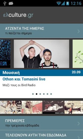elculture 1Μάθετε όλα τα πολιτιστικά δρώμενα που παίζουν στην Αθήνα και τη Θεσσαλονίκη μέσα από μια εύχρηστη και κυρίως ενημερωμένη εφαρμογή. Το ElCulture ή αλλιώς ελculture σας ενημερώνει καθημερινά για όλες τις πολιτιστικές εκδηλώσεις. Αυτό που έχετε να κάνετε είναι να επιλέξετε την κατηγορία που επιθυμείτε, ανάμεσα σε θέατρο, μουσική, φεστιβάλ, cinema και εκθέσεις. Μια ενδιαφέρουσα κατηγορία είναι αυτή της “Ατζέντας της Ημέρας”. Με ένα απλό tap μπορείτε να ενημερώνεστε για όλα τα καθημερινά δρώμενα απλά και γρήγορα. Μπορείτε επίσης να συμμετέχετε σε διαγωνισμούς και να κερδίζετε προσκλήσεις. Τέλος, αξιοποιώντας τα δεδομένα για την τοποθεσία, σάς δίνεται η δυνατότητα λήψης στοχευμένων προτάσεων με επιλογές κοντινές στο σημείο το οποίο βρίσκεστε.