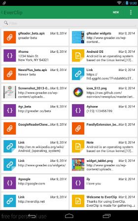 Η εφαρμογή Everclip είναι ουσιαστικά ένας διαχειριστής για ότι αντιγράφεται στο πρόχειρο της Android συσκευής σας, η οποίο σας επιτρέπει να κρατήσετε και να οργανώσετε συνδέσμους, τμήματα κειμένου και άλλα πολλά ακόμα τα οποία χρησιμοποιείται συχνά στη συσκευή σας. Ιδανικό για όσους χρησιμοποιούν το Android smartphones τους για εργασία περισσότερο από το ότι να παίζουν κάποιο παιχνίδι, το Everclip μπορεί σίγουρα να σας εξοικονομήσει πολύ χρόνο, αλλά το πιο ενδιαφέρον στοιχείο της εφαρμογής είναι η προγραμματιζόμενη δυνατότητα επέκτασης κείμενου, η οποία σας επιτρέπει να ολοκληρώσετε μια φράση απλά πατώντας μερικά πλήκτρα σε ένα συγκεκριμένο μοτίβο, κάτι το οποίο είναι πολύ χρήσιμο πράγματι.