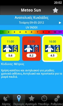 Meteogr Sun mainΗ εφαρμογή Meteo.gr Sun ήρθε για να σας βοηθήσει να απολαύσετε τoν ήλιο, αποφεύγοντας τους κινδύνους της εκτεταμένης έκθεσης στην ηλιακή ακτινοβολία. Χρησιμοποιώντας το Meteo.gr Sun μπορείτε εύκολα και γρήγορα, επιλέγοντας τη τοποθεσία που σας ενδιαφέρει, να ενημερωθείτε για το δεδομένο δείκτη UV και να προετοιμαστείτε κατάλληλα. Το Meteo.gr Sun είναι μια απαραίτητη εφαρμογή στην Ελλάδα ιδιαίτερα κατά τη διάρκεια του καλοκαιριού που ο δείκτης UV φτάνει έως και 10-11, τιμές επικίνδυνες που απαιτούν προστασία από τoν ήλιο. Σημαντικό είναι να λάβουμε υπ όψη πως τα βλαβερά αποτελέσματα της ηλιακής ακτινοβολίας δεν εξαρτώνται μόνο από την ένταση της ακτινοβολίας αλλά και τoν βαθμό ευαισθησίας ευπαθών ομάδων όπως βρέφη, ηλικιωμένοι αλλά και άτομα με ανοιχτό τύπο επιδερμίδας. Ενημερωθείτε λοιπόν ανά πάσα στιγμή από το iPhone σας και σιγουρευτείτε πως προστατεύεστε από την ηλιακή ακτινοβολία.