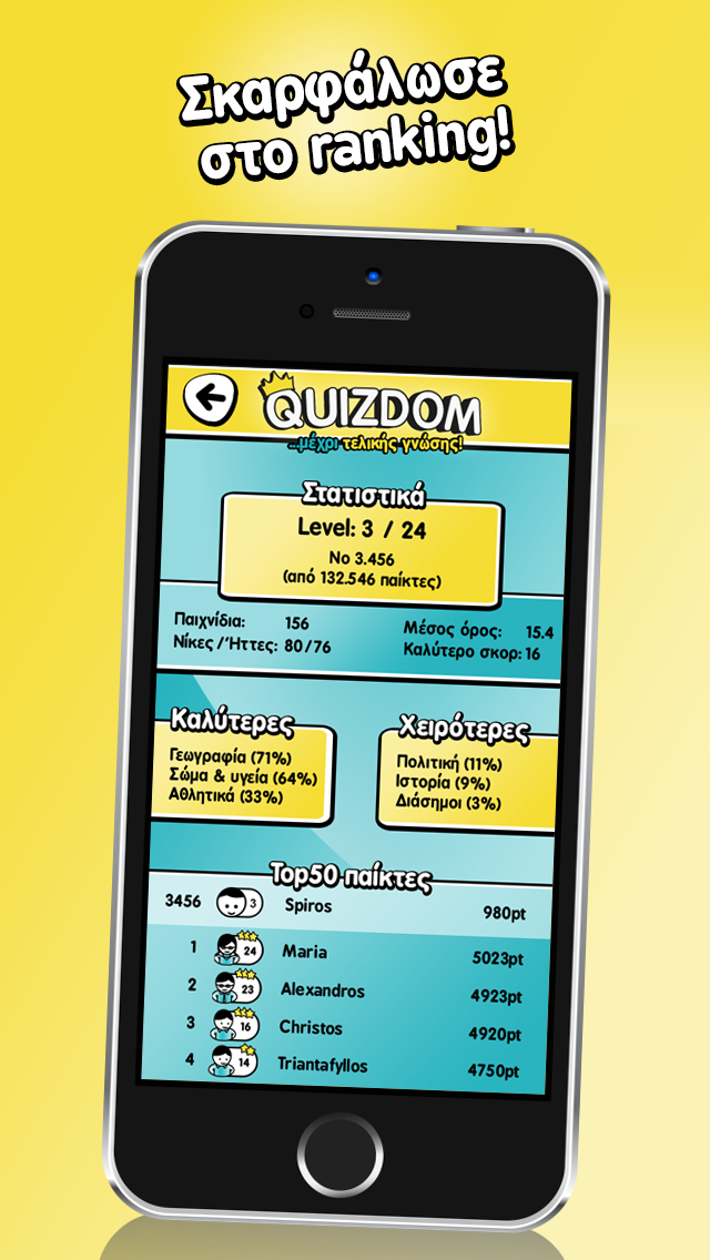 Και απ’ ότι φαίνεται το καταφέρνουν αρκετά καλά, αφού σε λιγότερο από 1,5 μήνα κυκλοφορίας το Quizdom έχει αποκτήσει ήδη φανατικό κοινό. Περισσότεροι από 35.000 μοναδικοί χρήστες έχουν κατεβάσει την εφαρμογή στο smartphone τους, με τους καθημερινά ενεργούς παίκτες να αφιερώνουν στην οθόνη τους περισσότερο από μία ώρα! Καθόλου τυχαίο λοιπόν το γεγονός πως πολύ γρήγορα ανέβηκε ψηλά στις λίστες με τις δωρεάν εφαρμογές του AppStore, ενώ εδώ και 6 εβδομάδες φιγουράρει πρώτο στην κατηγορία των παιχνιδιών Trivia.