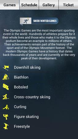 Αυτό το app παρέχει μεταξύ των άλλων το πιο πρόσφατο φωτογραφικό υλικό όλων των αθλητικών γεγονότων μέχρι σήμερα από το Sochi αλλά και όλες τις εκδηλώσεις των χειμερινών ολυμπιακών αγώνων. Εμφανίζει το πρόγραμμα εκδηλώσεων των χειμερινών Ολυμπιακών Αγώνων 2014, λεπτομερή κατάλογο των εκδηλώσεων και των αθλητικών αγώνων, φωτογραφίες από διάσημους αθλητές. Η εφαρμογή μπορεί να λειτουργήσει και χωρίς πρόσβαση στο διαδίκτυο, εκτός φυσικά από την πλατφόρμα αγοράς εισιτηρίων. Γενικά πρόκειται για μια καλοσχεδιασμένη εφαρμογή που θα σας παρέχει όλες τις πληροφορίες για τους χειμερινούς ολυμπιακούς αγώνες.Περισσότερες πληροφορίες: http://www.zekab.com/cgi-sys/defaultwebpage.cgi